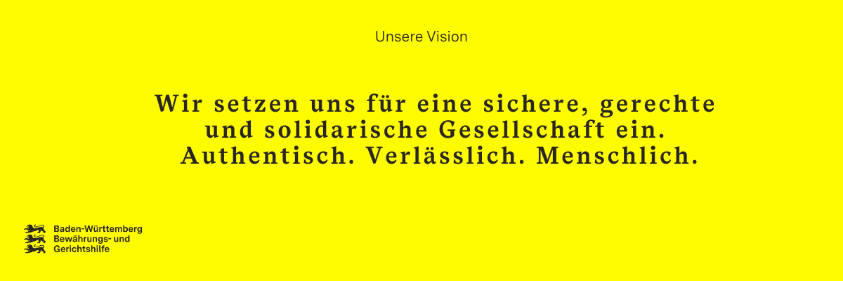 Die BGBW setzt sich für eine sichere, gerechte und solidarische Gesellschaft ein. Authentisch. Verlässlich. Menschlich. Wie wir das erreichen wollen? Wir schaffen Perspektiven für straffällige Menschen, unterstützen von Straftaten Betroffene und setzen uns dafür ein, den Resozialisierungsgedanken in der Gesellschaft zu verankern. Das nachfolgende Leitbild fasst zusammen, welche Aufgaben wir konkret innehaben, welches Selbstverständnis wir mitbringen und welchen Grundprinzipien wir in unserer täglichen Arbeit folgen.